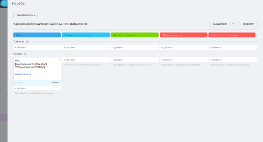 Вы можете добавлять роботов на любые события в разделах лиды, сделки, задачи. Использовать отправку уведомлений можно как ответственным лицам, руководителям так и вашим клиентам.